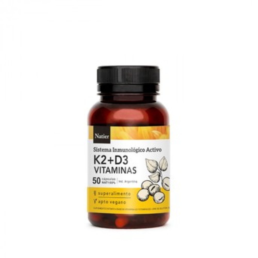 as vitaminas K2 + D3 de Natier en cápsulas de 50 unidades están diseñadas para la salud de huesos y dientes, y brindan apoyo al sistema inmunológico y cardiovascular. Estas vitaminas trabajan de forma sinérgica, donde la D3 ayuda a la absorción de calcio y la K2 asegura que el calcio se dirija correctamente a los huesos.