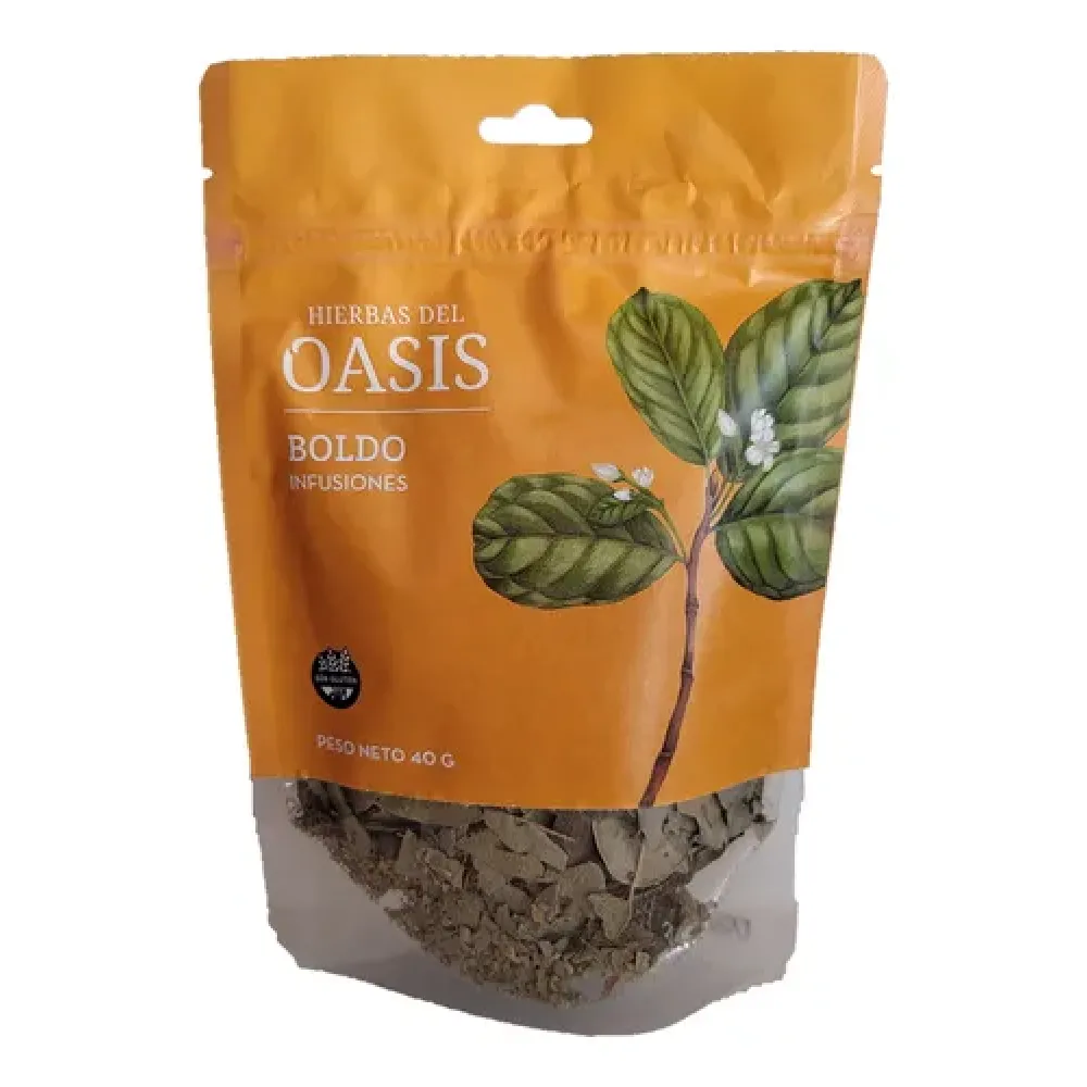 Boldo Hojas Pura x 40 Gr Doypack de Hierbas del Oasis es una infusión en hebras de alta calidad, libre de gluten (sin TACC), y se destaca por sus propiedades digestivas y hepatoprotectoras. El empaque doypack ayuda a conservar sus propiedades y aroma.