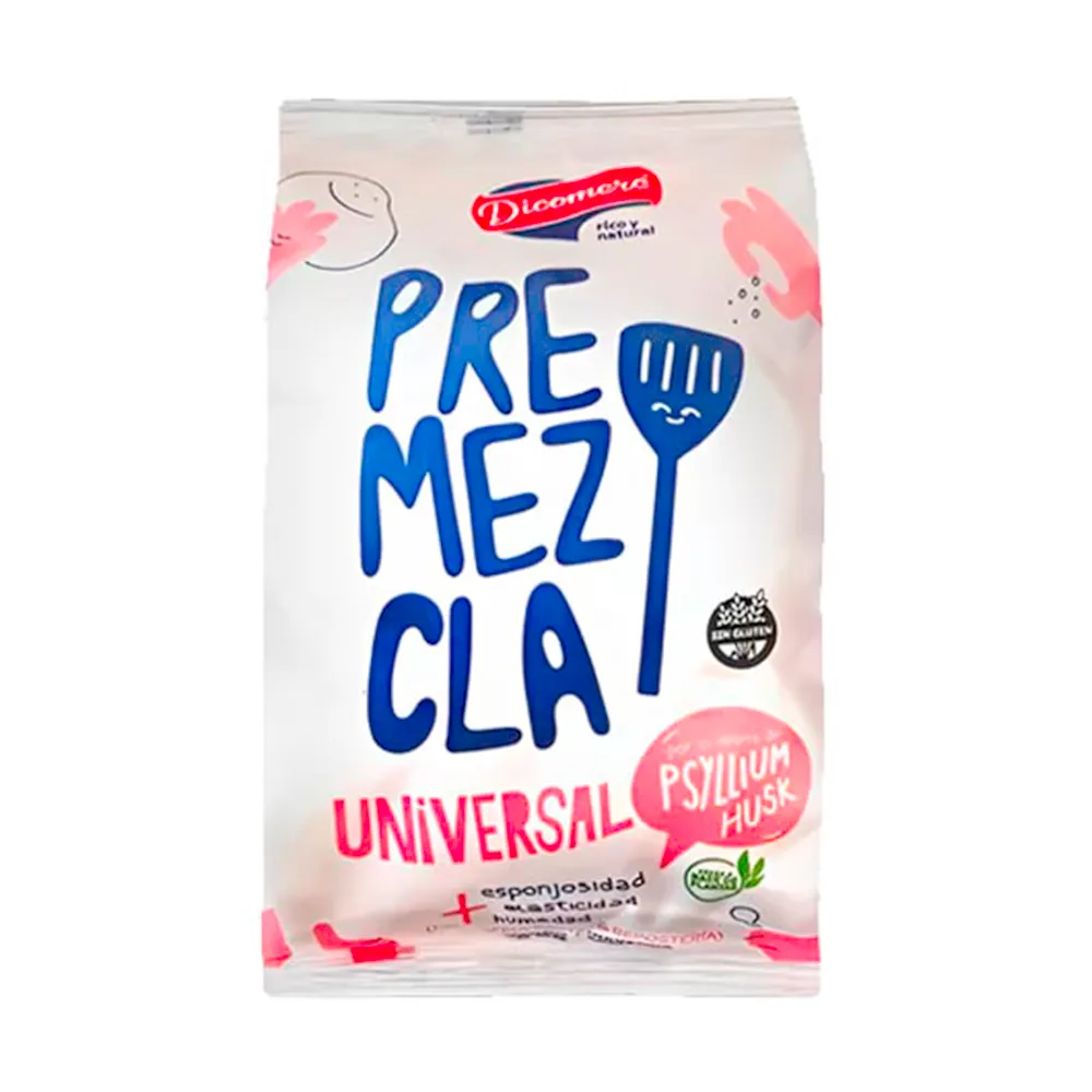 La Premezcla Universal con Psyllium Husk de Dicomere es una base sin gluten, versátil y enriquecida para diversas preparaciones de panadería, pastas y repostería. Su ingrediente principal, el psyllium, mejora la calidad de las masas y aporta beneficios a la salud digestiva.